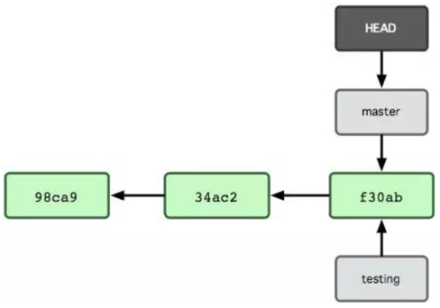 每个分支都是相互独立的,例如master和testing,变更master分支中的内容,不会影响testing分支中的内容,不要被上面图片所迷惑,它们俩只是刚开始的时候指向了相同的commit对象,前面的变更内容都是相同的,因为都是以f30ab为基线的,但是各自分支上的变更操作只影响对应分支的内容,切换到不同的分支也只能看到各自分支的内容。