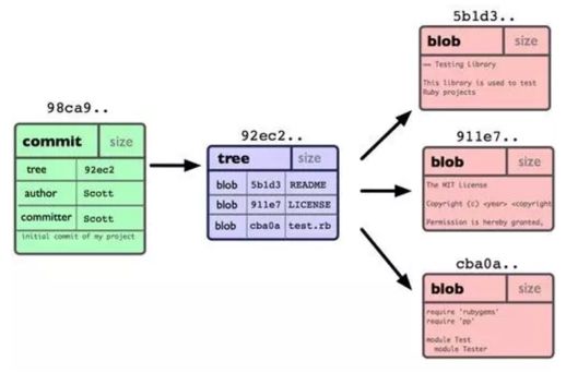 git是如何存储我们的操作记录和文件的呢?这里就需要了解一下git内部的三个对象:blob对象、tree对象和commit对象。blob对象用来存储文件的内容,它的键是使用SHA1算法生成的。tree对象可以看作一个目录,管理其它tree对象或是blob对象,可以把它们看做子目录和文件,tree对象内部存储指向blob对象或是其它tree对象的指针,一般用来表示内容之间的目录层级关系。commit对象存储tree对象的指针,并记录提交者信息、原作者信息、时间戳和提交的注释,同时还存储上一次提交的commit对象指针等(第一次提交不存储上一次提交的commit对象指针)。下面用一张图展示它们之间的关系。