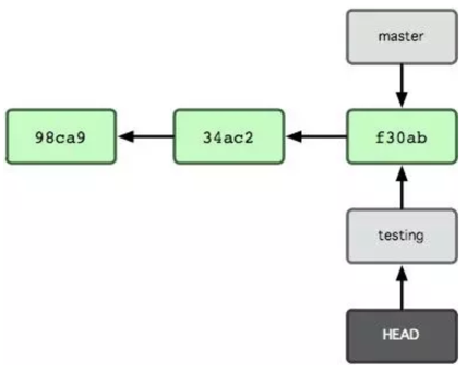 又例如下图中,HEAD指向testing分支,表示工作空间当前已经切换到了testing分支。