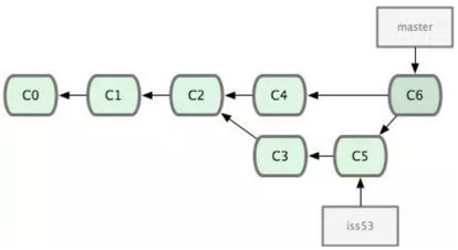 此时如果直接把iss53分支合并到master主干分支,就会生成一个合并提交C6,并且此时master指向这个commit对象,这就是分支合并。
