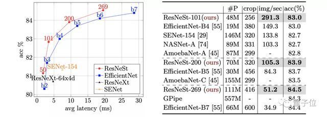 通过将ResNeSt和其他50层和101层配置、类似复杂度的ResNet变体作比较,TOP-1精度达到了最高,如下表所示。