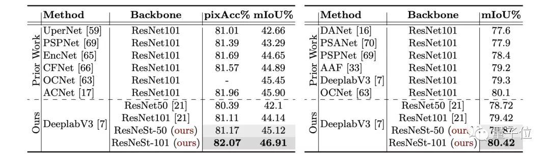 值得注意的是,使用ResNeSt-50的DeepLabV3模型的性能,比使用更大的ResNet-101的DeepLabV3更好。