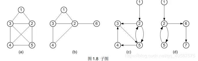 子图:例如,图 1.8(a)、(b)所示的无向图都是图 1.1(a)所示的无向图G1的子图