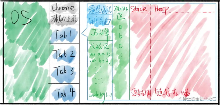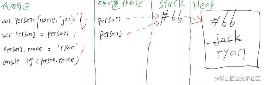上图我们可以简单的看作电脑内存,我们的JS代码就存放在代码区,变量存放在不知道什么区,而数据则专门存放在Stack(栈区),Heap(堆区)中。
