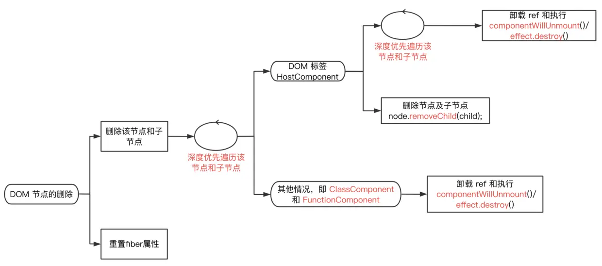 删除目标节点及其子节点,如果目标节点或子节点是类组件ClassComponent的话,会执行内部的生命周期 API——componentWillUnmount()