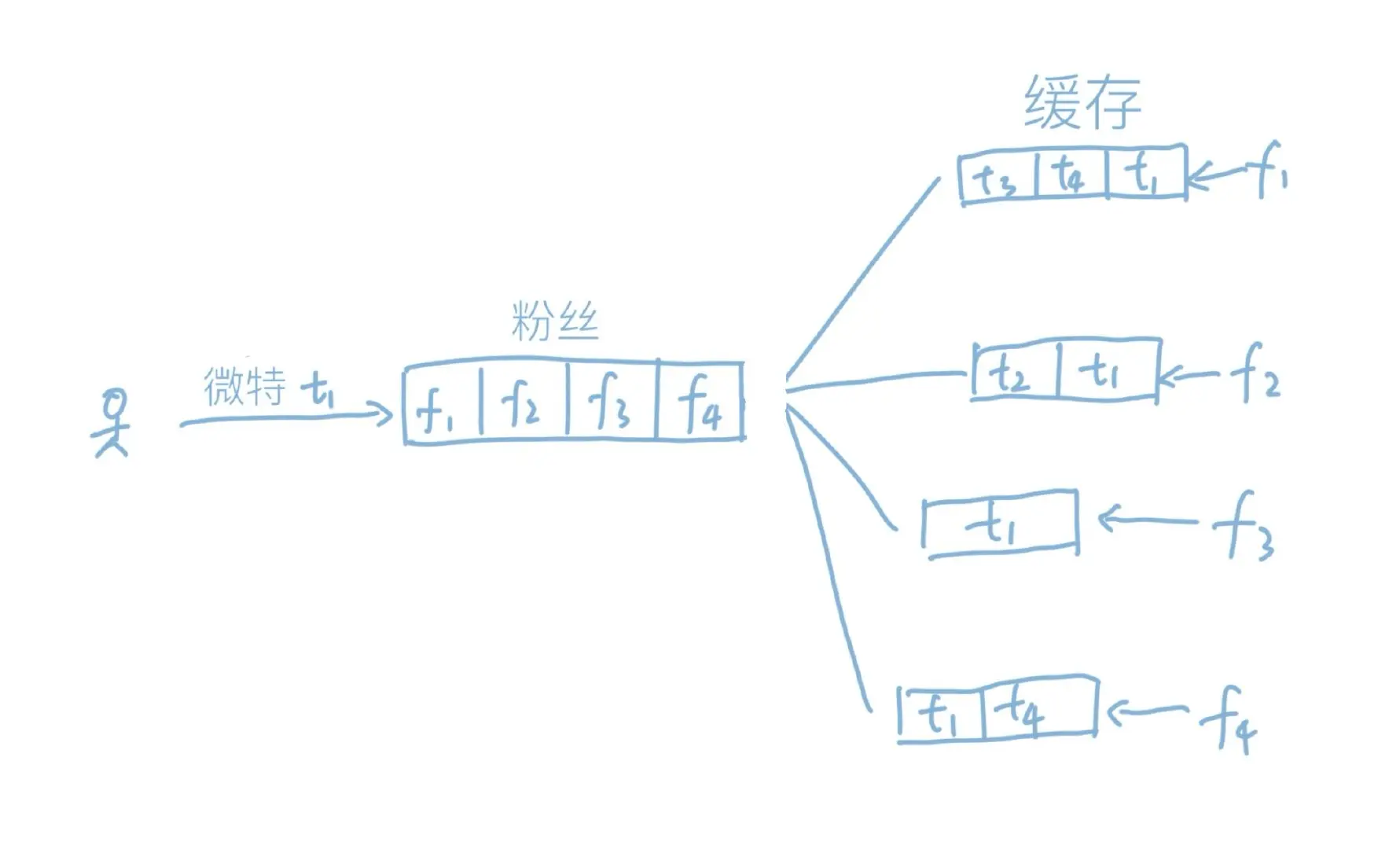新官上任三把火,搞走了几个混吃等死的老白兔,C又招来当年的几个手下,开始大张旗鼓地重构系统。在分布式系统当中,DB往往都是瓶颈,能不用DB的就不应该用DB。而且微特的模式非常明显,用户发布了新内容之后,最关心的就是他的粉丝,那么我们直接在他更新的时候,就把内容推送到粉丝的缓存里,当用户刷新的时候,直接从缓存拉取数据,这不是要方便得多吗?