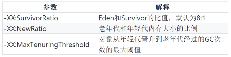 -XX:PretenureSizeThreshold,大于此值的对象直接在老年代分配,避免在 Eden 和 Survivor 之间的大量内存复制。