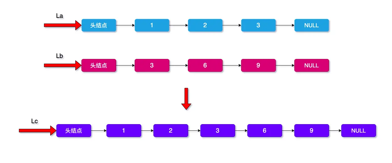 //pa 是链表La的工作指针,pb 是链表Lb的工作指针, 初始化为首元结点;La的头结点作为Lc的头结点;