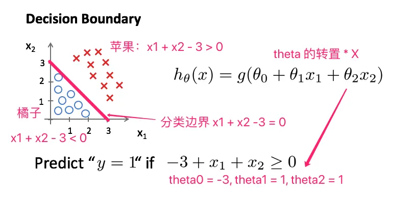 在分类问题中存在分类(决策)边界(Decision Boundary)的概念,因为我们最终是要将数据用函数分类,体现在坐标系中就是函数曲线把数据分为 2 类,比如一类是苹果,一类是橘子。