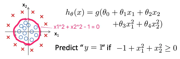 这个例子的分类边界是直线,其实分类边界也可以是非线性边界,比如一个圆: