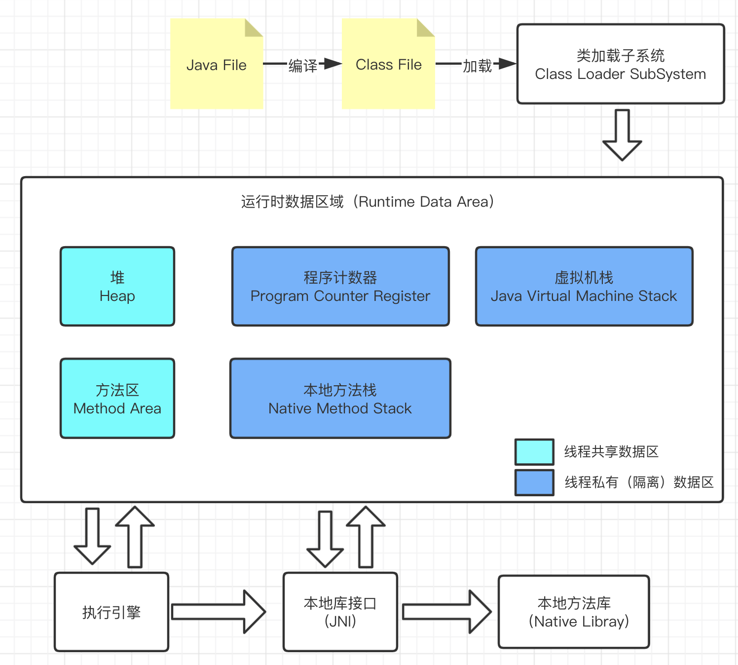 先上图,由图中可以看到,整个虚拟机大致由三个子系统组成类加载子系统、运行时数据区、执行引擎。