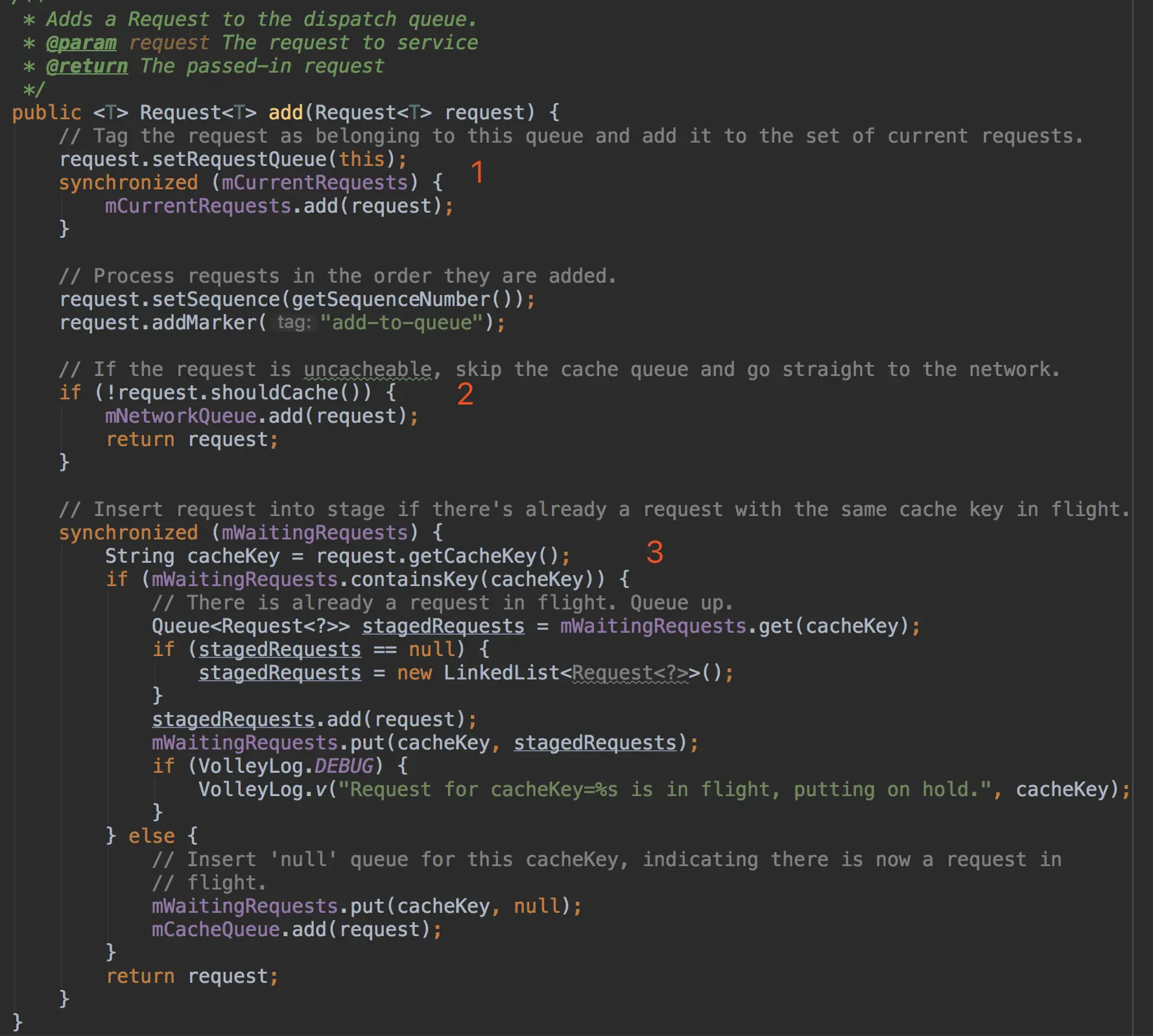 前期的创建工作完成了,接下来分析如何处理网络请求的,先从RequestQueue中的add方法开始,它的作用是将网络请求添加到相应的队列中,再去相应的处理,一般由业务层发起。