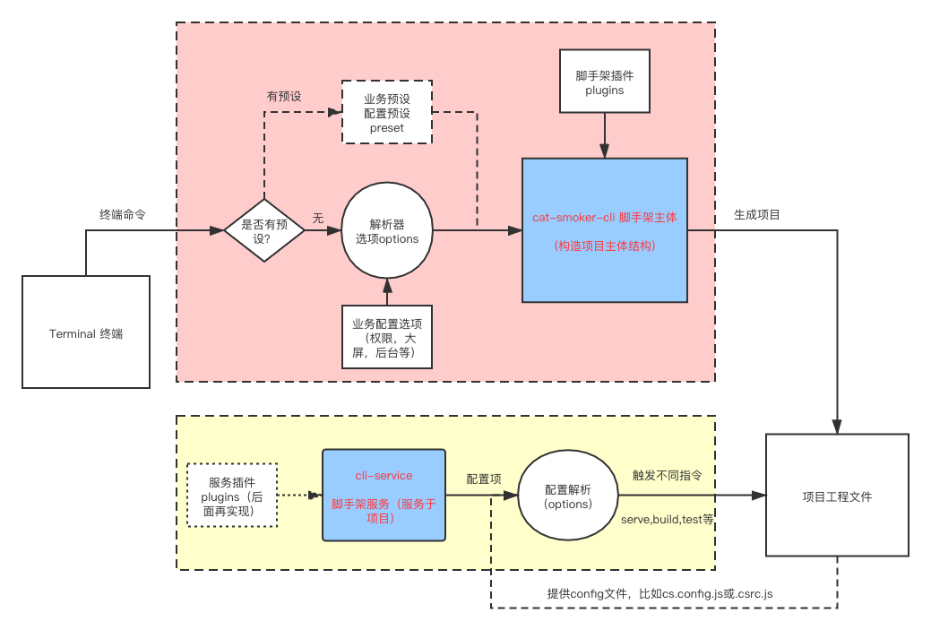 cli-service为我们提供了黑箱操作,我们可以在内部进行webpack设置,优化(optimization)配置,打包(第三方,过滤,cdn设置等业务)配置,runtime,项目路由,webpackChain链,项目模板,业务架构等配置等都集中从黑箱抛出一个cs.config.js来配置这一切,可以实现规范化,这就是基础化的cat-smoker架构。