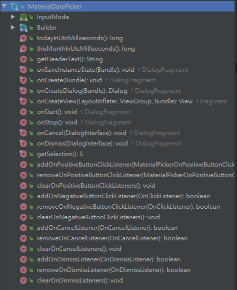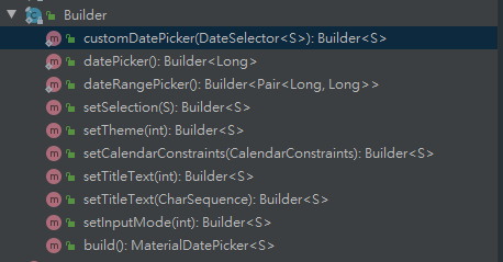首先我们先看看MaterialDatePicker.Builder里,有什么方法供我们使用。