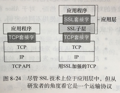SSL技术上的实现是在应用层的,如果一个应用程序要使用SSL的服务,他需要在该应用程序的客户端和服务端包括SSL的代码(使用现有的一些类库)。SSL有他自己的套接字API,这类似于传统的TCP套接字API。