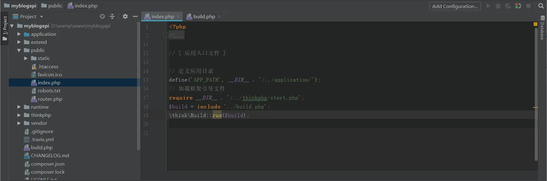 这两行代码的作用是自动生成application目录下的文件(你也可以选择使用命令的方式生成,>php think build),我们可以打开跟目录下的build.php来配置你想要的目录结构和文件,这里我就不做更改,按照它默认配置进行生成,接下来你只要在浏览器上访问下