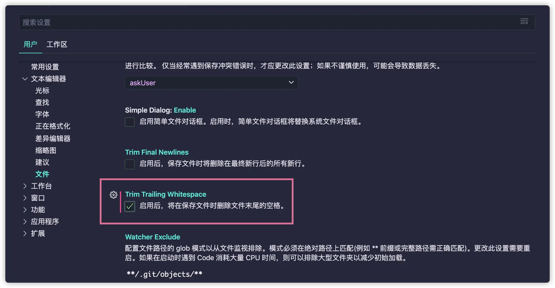 文本编辑器>文件中找到Trim Trailling Whitespace并且勾上(我们也可以在搜索框直接输入Trim Trailling Whitespace快速找到这个配置的位置),可参考下面的截图。