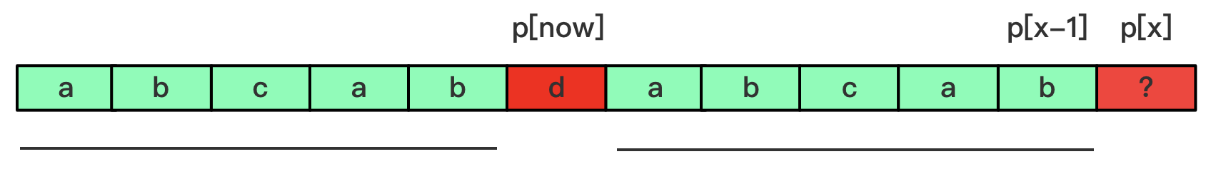 p[now]!=p[x],对比p[next[now-1]]和p[x]。