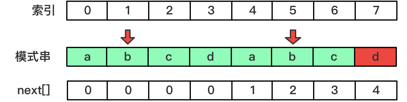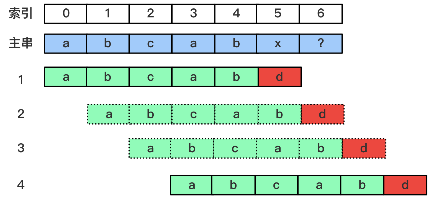 d其他的字符都已经匹配成功,因此模式串中p[1-4]位置的字符应该也是"abca" - 综上,模式串中