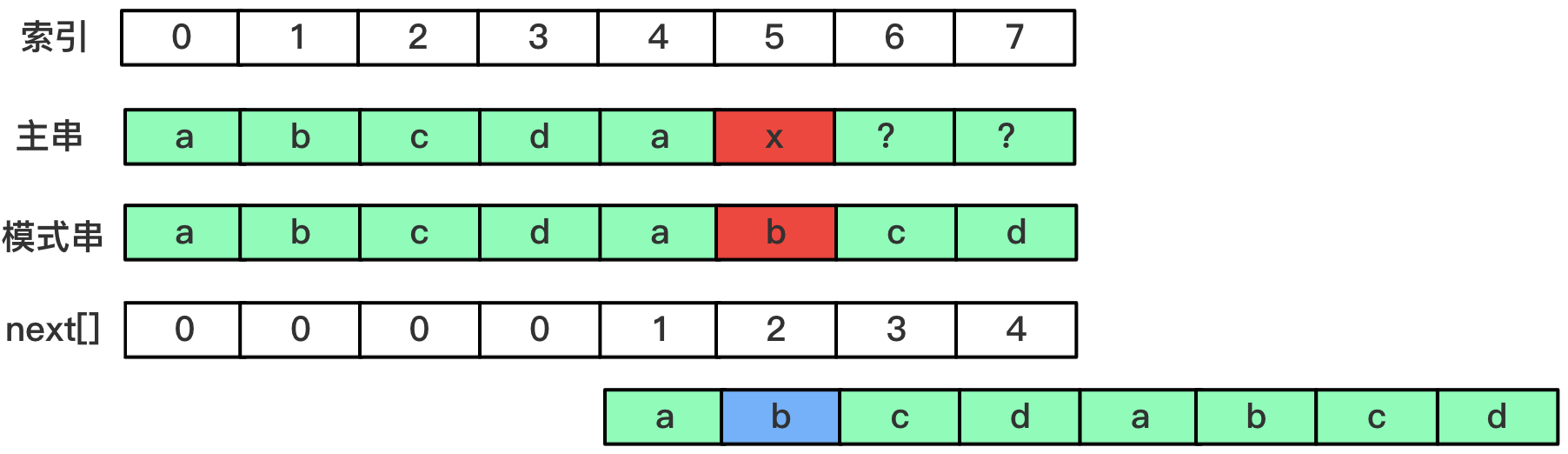 字符x和模式串索引5处字符b不相等,根据我们的匹配规则,此时应该将模式串的当前索引移动到next[5-1]即索引为1的位置,此时我们可以发现,因为p[1]和p[5]都为b,相等,显而易见此次匹配也不可能成功,如果我们可以自动跳过这次匹配就好了。