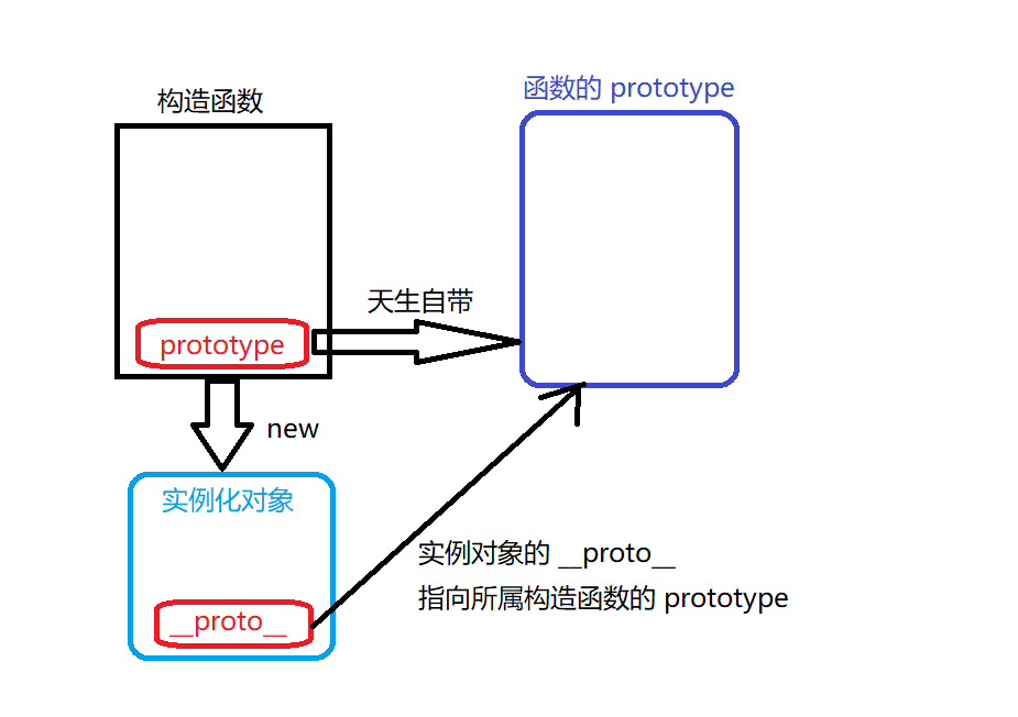 - 构造函数在生成实例化对象时,会将自己 prototype 这个空间的地址赋值给实例化对象 的__proto__来存储。 实际上,构造函数的 prototype和生成的实例化对象的__proto__指向的是同一个存储空间,可以相互调用数据。