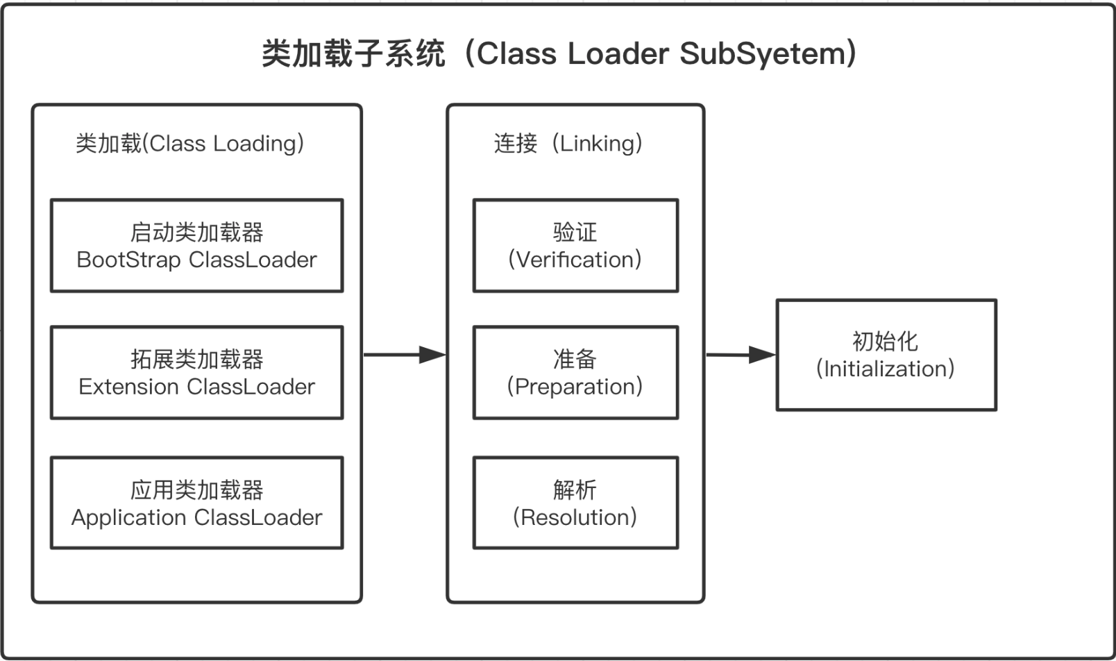 本篇讲解的都是第一个过程,加载字节码文件。其关键就是类加载器,由类加载器来负责把class字节码文件加载到内存中。需要注意的是,类加载器虽然只是执行了类加载的动作,但是在Java程序中,并不是说它只会在类加载阶段才会起到作用。