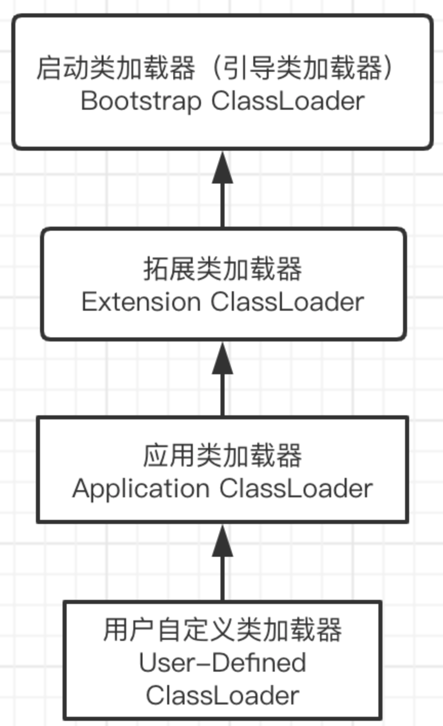 - 类加载器在收到类加载请求之后,首先会将该类加载请求向上委托给自己的父类去加载,而并不会直接由自己加载该类。