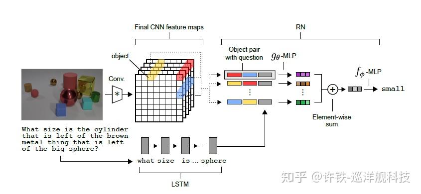 这类网络在图像理解这样的具体任务里效果远超一般的深度网络。 比如下面那个有不同几何体的图, 让神经网络回答图里左边柱体的大小是个困难的问题 。但是结合了CNN和LSTM的关系网络回答自如。 这种模型正如整合了深度学习的感知能力和符号主义的认知能力。