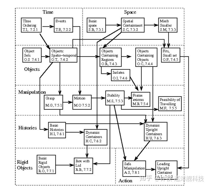那么我们必须植入这棵知识树。 然而人类的知识汗牛塞屋, 如果一个个都放进去这是不可能的任务。 我们就需要注意知识本身的层级。 人的知识既包含那些只有维基百科里出现的知识比如某国家的首都, 也包括一些连我们自己都说不出的基本常识,比如什么是运动。 所以我们可以把这些知识分成几个层次: 1 最基础的关于世界物理结构的先验, 比如物体的概念, 平移旋转等运动形式 2, 具体的事物和概念, 类似于知识图谱的形式 3, 关于抽象结构的知识, 如各种逻辑关系, 代数, 语法,一些基本规则。