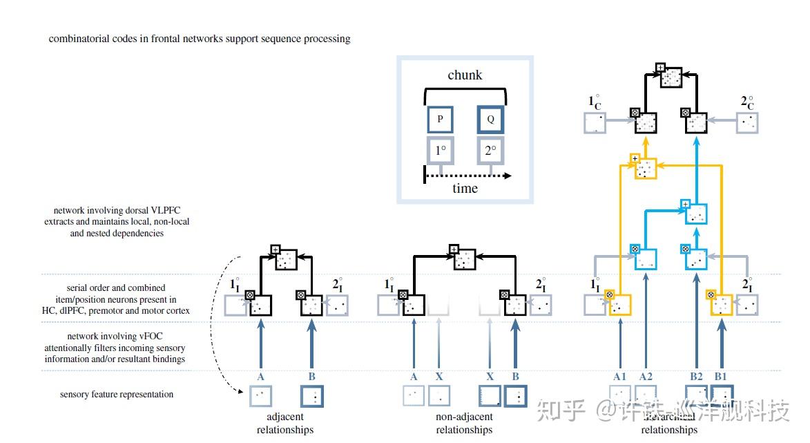 我们说一个典型的实现在大脑里实现这类操作的例子是VSA , vector symbolic achitecture(向量符号框架) ,一种针对高维神经向量(大量神经元的活动)的符号运算框架 。 这个框架仿佛是用神经科学方法实现的计算编程框架。 我们知道大脑接受的一般都是序列输入, 这些输入在VSA框架里, 序列会首先经过chunking区块化成为一个个符号, 当然具体如何chunking这涉及感知部分的学习, 也不是这里的重点。 chunking后的一个个符号,可以和大脑预先已经存在的一些“类”结合,经过某些特定操作, 最终形成各种组合表达(如同类的实例化)。
