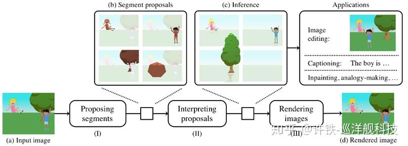 比如我们知道CNN代表的视觉网络是个黑箱, 那么如何让这个黑箱变得可解释? 我们可以让CNN网络直接把图像变成一系列可解释的符号 。 你可能觉得这不就是region proposal或图像切割? 实际不是的, 因为我们想要得到的符号可以代表一个世界的最小语言体系, 检验它的最好标准是得到的符号能否让我们复原图像。 这有点像一个自编码器的概念, 但是比自编码器要更容易解释。为了做到这点,我们可以把解码器替换成一个传统的图像生成引擎, 它本身就是基于人工设定的符号, 只有我的CNN能够输出这样的人工设定的符号, 传统解码器才能work。 这样的模型可以得到完全可解释的视觉系统, 在各种需要说明如何work的视觉系统里, 无疑会发挥大用。 具体pipeline如下图。
