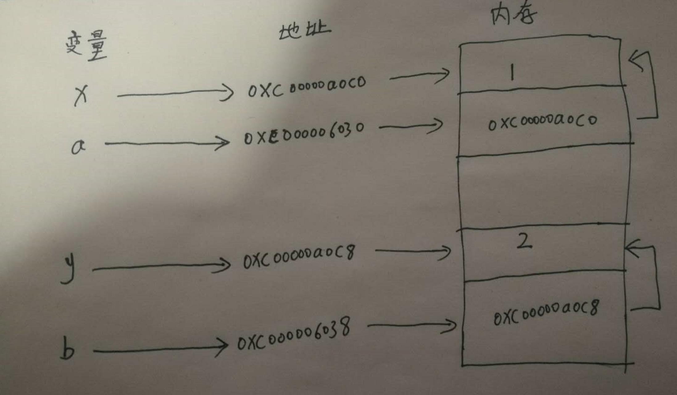 从第二种结果打印我们知道,a,b自己本身也有地址,区别在于他们的地址指向的值是x,y的地址,所以b,a=a,b这种相当于把内存这一列的值进行对调(也就是0xc00000a0c0和0xc00000a0c8对调一下),但是ab本身地址没有改变,由于内存的地址值变了,所以ab的值所指向的值也对调了(也就是*a,*b的值对调了),从图上来说,ab与xy没有关系