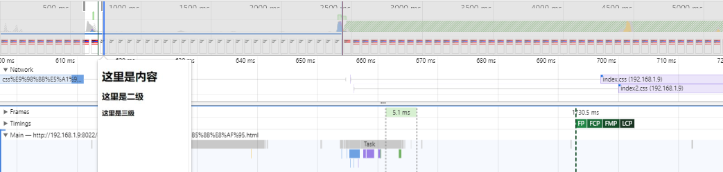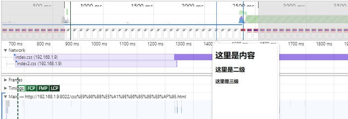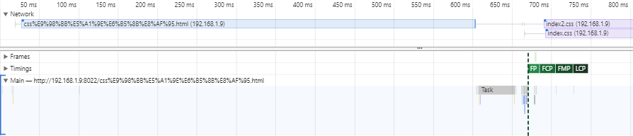 可以看到,在HTML文件加载完,两个index.css文件加载之前,Main函数进行了HTML解析渲染,页面显示出了已经解析的HTML内容。并且两个css文件是并发加载的。