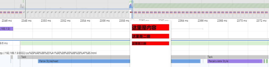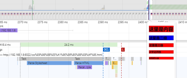 在这里我将css文件放到body内容中,可以看到在HTML加载完,css加载之前,页面将已经解析的部分HTML渲染出来了,等到css加载完成之后,又执行了一次页面的渲染流程