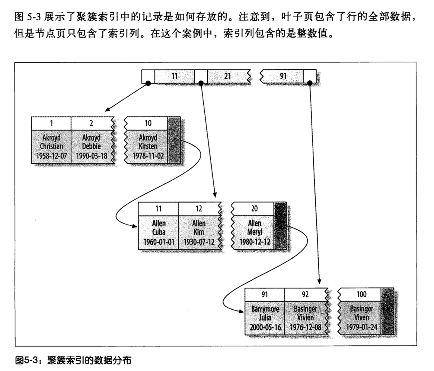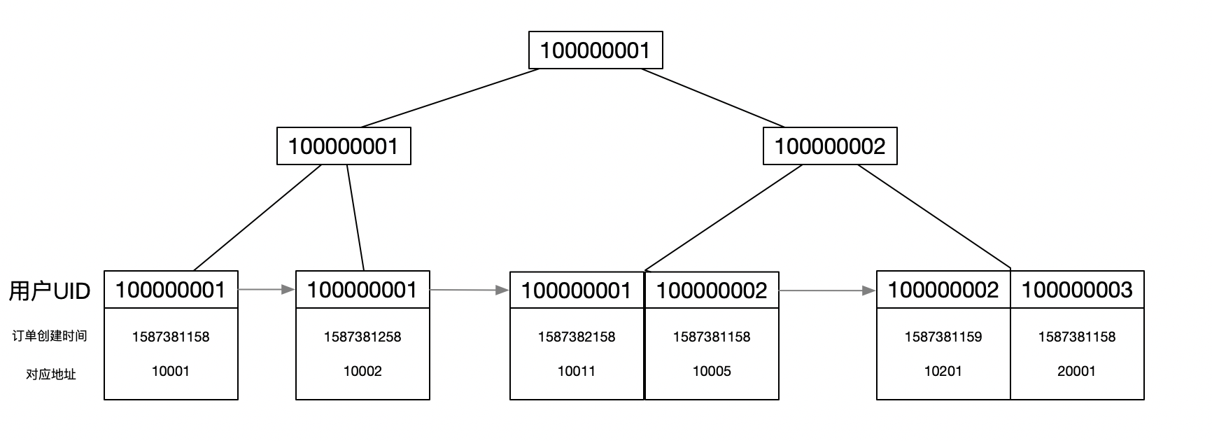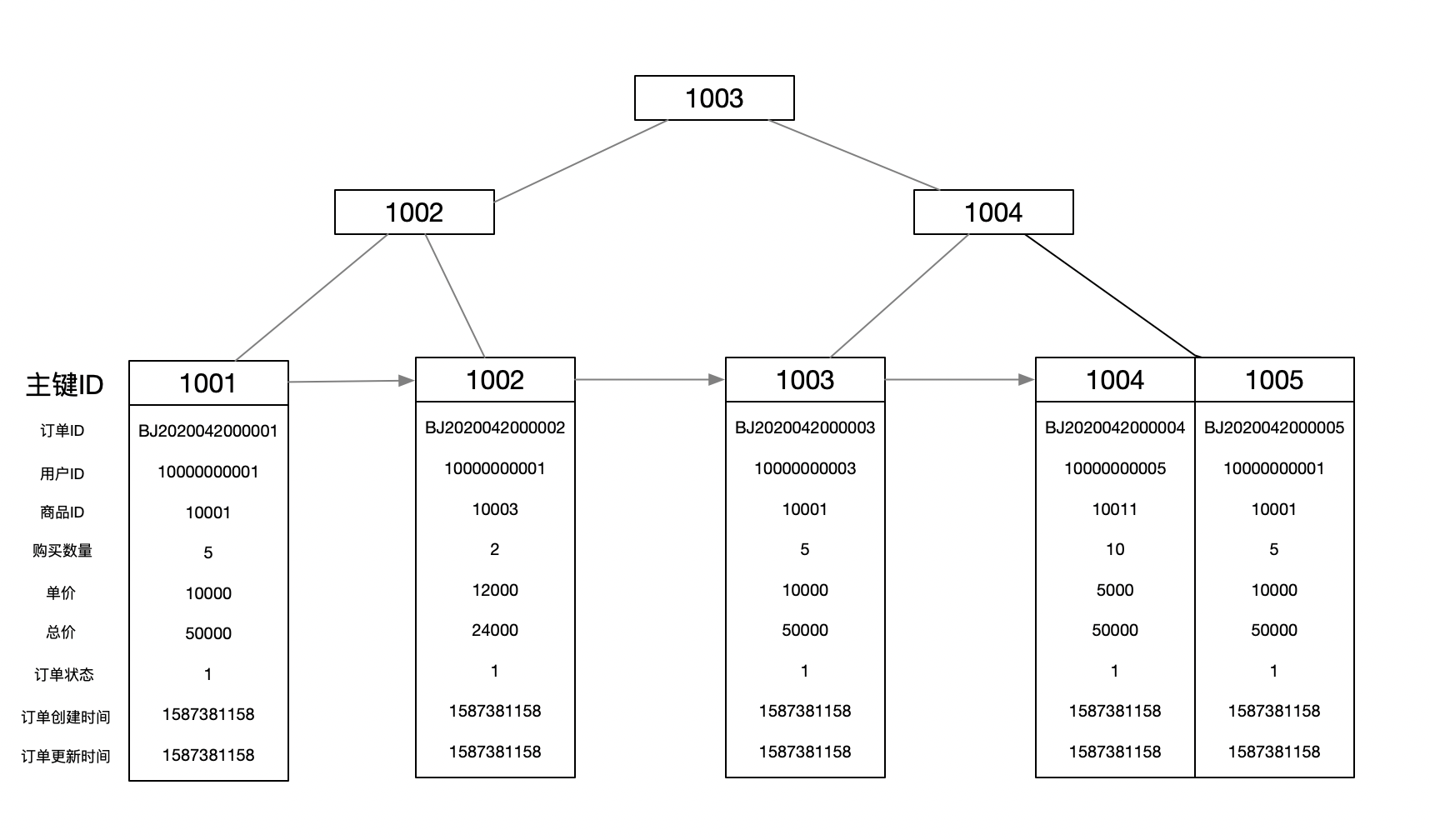 ) ENGINE=InnoDB DEFAULT CHARSET=utf8 COMMENT='订单表'针对聚集索引:系统会生成一个B+Tree用来记录索引数据,聚集索引存储结构见图中示例,示例为3层的B+Tree: