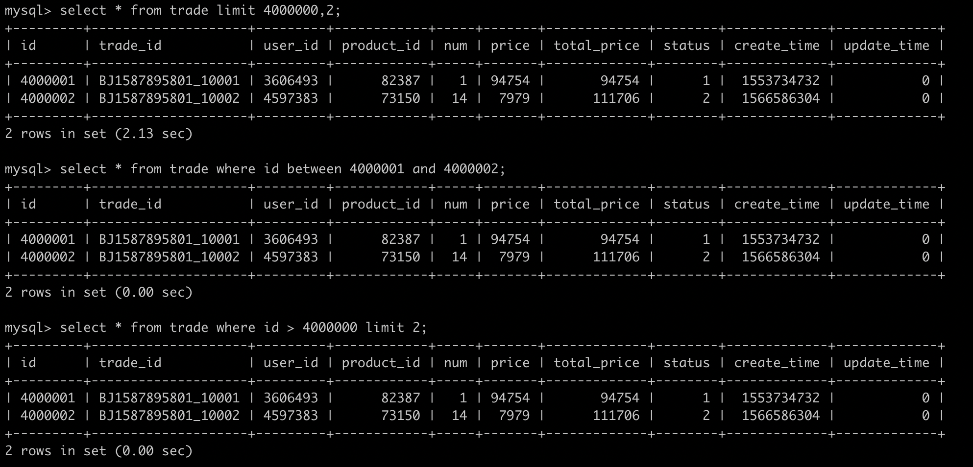 select * from trade where user_id = 10001;
