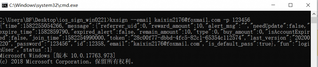 kxsign --email kaixin2176@foxmail.com -p 123456