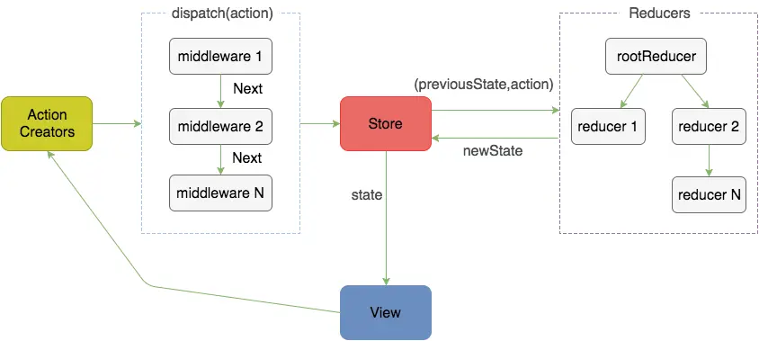 在实际开发过程中,除 action 和 reducer 之外,还会用到一些中间件 middleware ,中间件本质就是在 dispatch 更改 reducer 之前做一些操作,这里涉及到 Redux 的一个重要 api:applyMiddleware ,在后续篇幅中会详细介绍。在实际的业务开发中,将所有更新 state 的逻辑都放入到单个 reducer 函数中都将会让程序变得不可维护,因此对 reducer 的拆分是很有必要的,这里也涉及到 Redux 的另外一个重要 api:combineReducers ,关于这部分在后文也会详细分析。如果加上这部分分析, Redux 的工作流就可以用下图更加详细的说明。