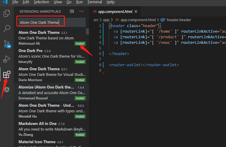1、点击扩展商店搜索你要找的插件名称如Atom One Dark Theme,点击安装。