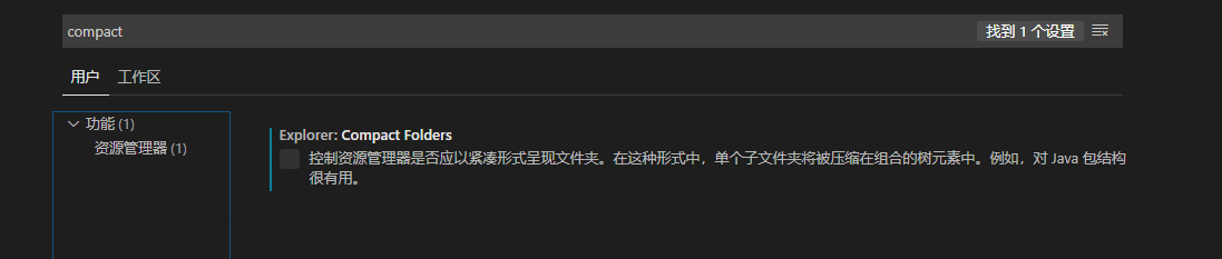左下角点击设置,在搜索框输入:compact,取消勾选即可。