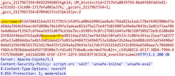 如果我们在一个HTTP页面传输数据,例如在一个登陆页面,输入自己的用户名和密码并发送给服务器,中途流量被截获了,直接泄露了我们发送的数据,像上图一样。而如果我们在部署了HTTPS的网站上登陆,因为数据在到达TCP前就交由TLS/SSL协议进行加密,之后再发送,所以中间流量被截获后,看到的也是经过加密的密文: