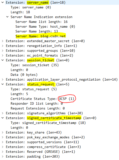 往下看还有客户端的扩展项,server_name表示客户端使用了SNI服务器名称指示扩展,告诉服务器请求访问的主机名,让服务器发送相应的证书供校验。session_ticket扩展就是告诉服务器请求使用SessionTicket方式进行会话恢复,第一次建立完整TLS握手时,客户端发送的该扩展是空的,由服务器决定是否支持SessionTicket。status_request扩展也是以前总结过,如果校验证书吊销状态方式使用OCSP在线证书状态协议,那么就是发送该扩展,如果使用OCSP套封,即由服务器来发送OCSP请求,获取响应后,服务器再向客户端发送CertificateStaus子消息,里面包含了证书吊销状态信息。还有一个signed_certificate_timestamp扩展表示支持证书透明度机制,由CA机构或服务器实体提交,Certificate Logs返回一个SCT信息,相当于也是一个票据,客户端再TLS/SSL协议握手阶段获取该SCT信息,证明该证书是经过监控和审计的。