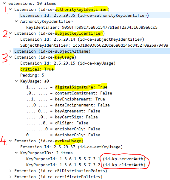 证书中有10个扩展项,authorityKeyIdentifier是CA密钥标识符,subjectKeyIdentifier则是使用者密钥标识符,subjectAltName扩展标识了服务器主机名。keyUsage扩展项比较重要,标识该证书的功能,例如digitalSignature:True表示可以进行数字签名,还有extKeyUsage扩展项,用来表示证书的使用场合,红笔圈起部分可以看到该证书可以用来进行服务器端身份校验和客户端身份校验。