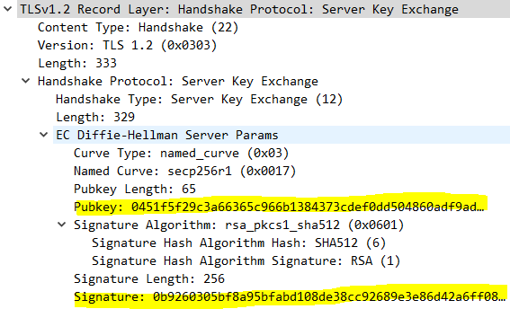 可以看到ECDH(EC Diffie-Hellman)参数服务器公钥Pubkey,Signature签名值是服务器端对该DH参数进行签名。