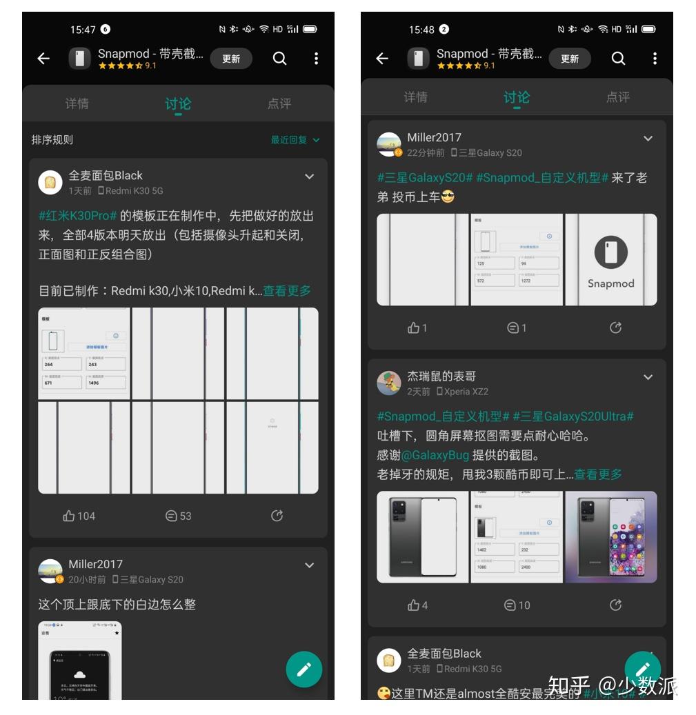 如果你觉得自己动手制作比较麻烦,也可以前往 Snapmod 的 酷安 评论区,看看评论区是否有热心用户分享自己想要机型的带壳截图素材和设置参数,直接下载套用即可。