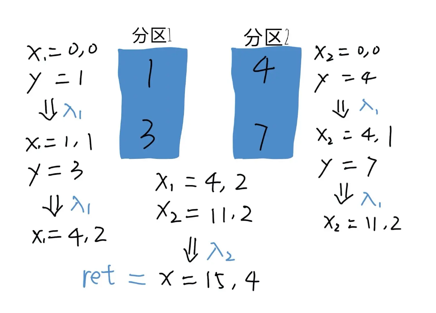 上图展示了两个分区的时候的计算过程,其中lambda1就是我们传入的第一个匿名函数,同理,lambda2就是我们传入的第二个匿名函数。我想结合图应该很容易看明白。