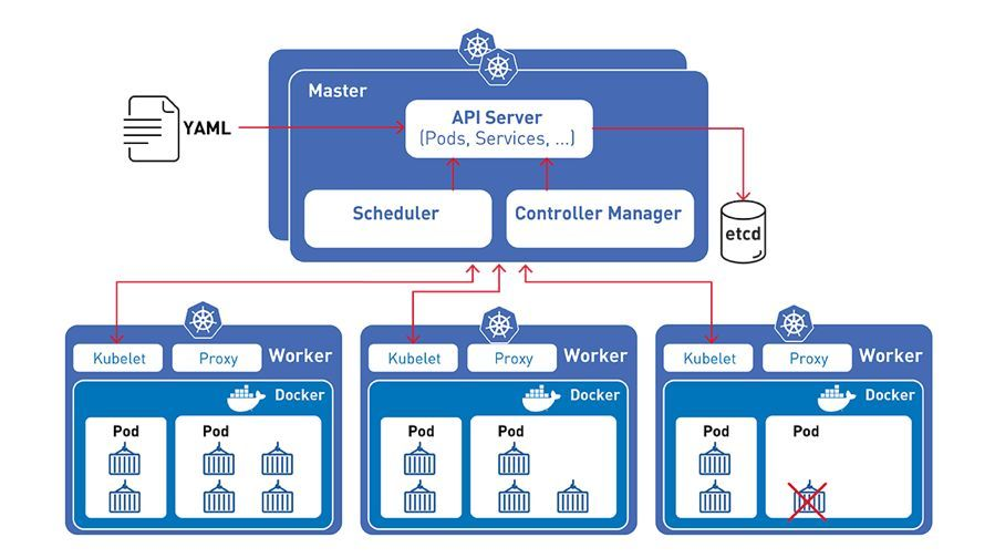 上面可以看到,Kubernetes 集群由 Master 节点和 Worker 节点组成,Master 节点上主要有三大组件:API Server,Scheduler 和 Controller Manager。而 Worker 节点上,有 Kubelet 作为代理,与 Master 节点进行通信,Proxy 作为容器交互的网络代理。