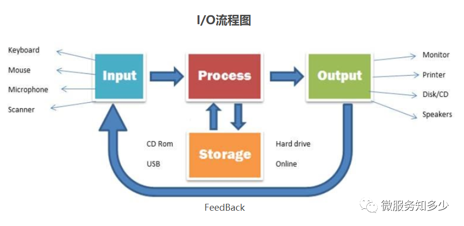 冯•诺伊曼计算机的基本思想中有提到计算机硬件组成应为五大部分:控制器,运算器,存储器,输入和输出。其中输入是指将数据输入到计算机的设备,比如键盘鼠标;输出是指从计算机中获取数据的设备,比如显示器;以及既是输入又是输出设备,硬盘,网卡等。