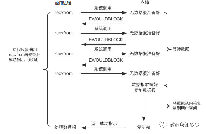那解决方案自然也容易想到,将阻塞变为非阻塞,那就是用户进程在发起系统调用时指定为非阻塞,内核接收到请求后,就会立即返回,然后用户进程通过轮询的方式来拉取处理结果。也就是如下图所示: