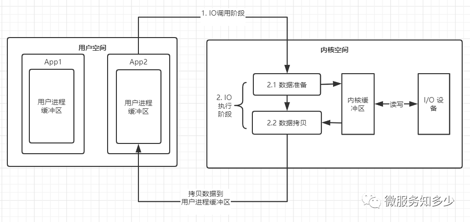 所以I/O之于应用程序来说,强调的通过向内核发起系统调用完成对I/O的间接访问。换句话说应用程序发起的一次IO操作实际包含两个阶段: